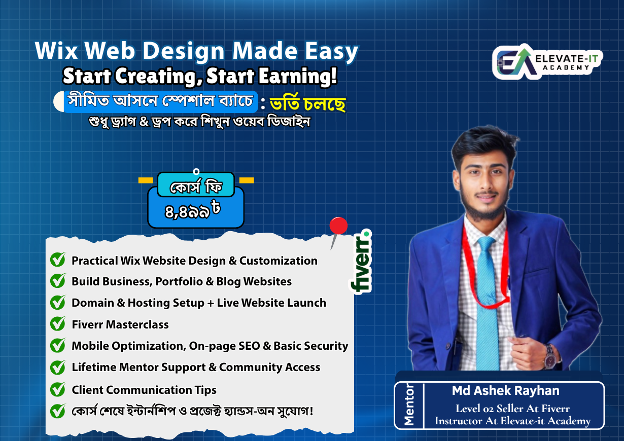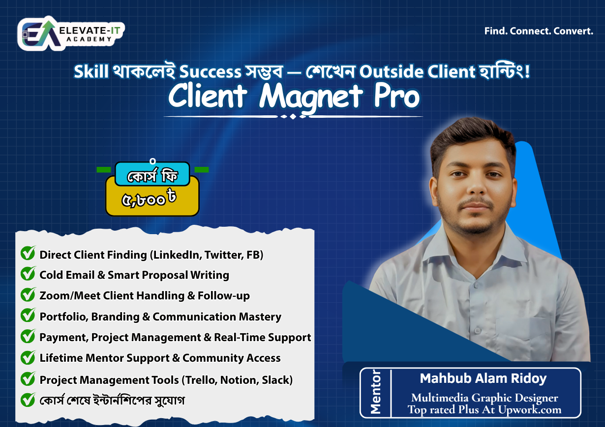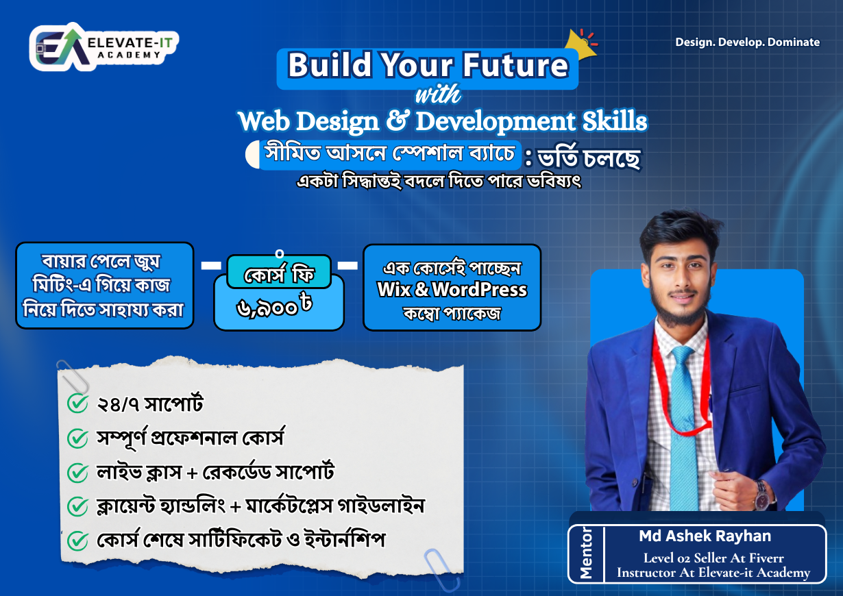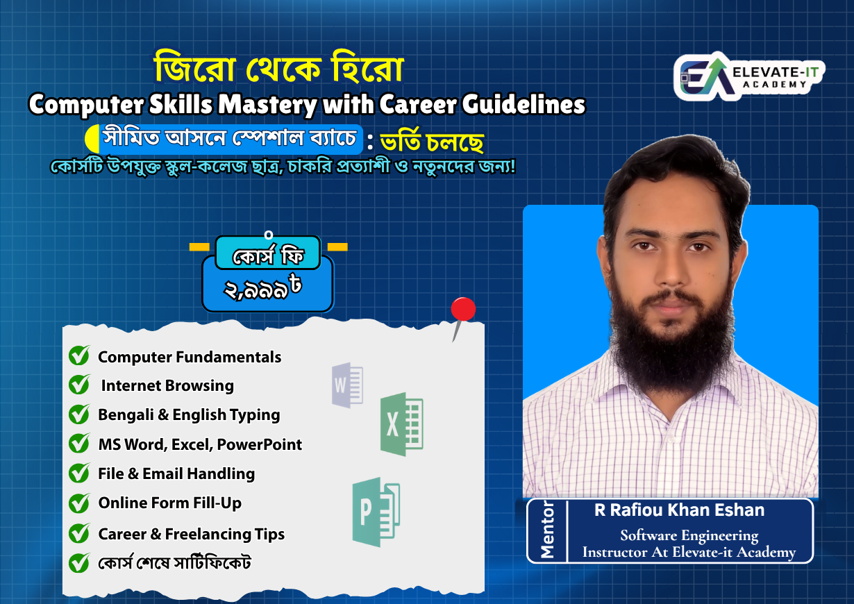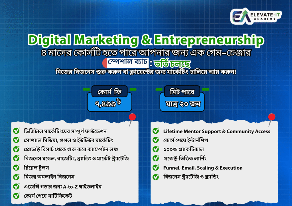 আমরা বিশ্বাস করি, ট্যাকটিক্যাল স্কিলই বদলে দিতে পারে একজন মানুষের ভবিষ্যৎ। Elevate IT Academy একটি আধুনিক ডিজিটাল লার্নিং প্ল্যাটফর্ম, যেখানে শেখানো হয় আন্তর্জাতিক মানের স্কিল । আমাদের অনলাইন ও অফলাইন আপডেটেড, সময়োপযোগী কোর্সগুলো পরিচালনা করেন অভিজ্ঞ মেন্টররা, লাইভ ক্লাস ও ফ্লেক্সিবল শিডিউলের মাধ্যমে। কোর্স শেষে শিক্ষার্থীদের দেওয়া হয় সার্টিফিকেট এবং দীর্ঘমেয়াদী সাপোর্ট, যাতে তারা আত্মবিশ্বাসের সাথে ক্যারিয়ার শুরু করতে পারে।